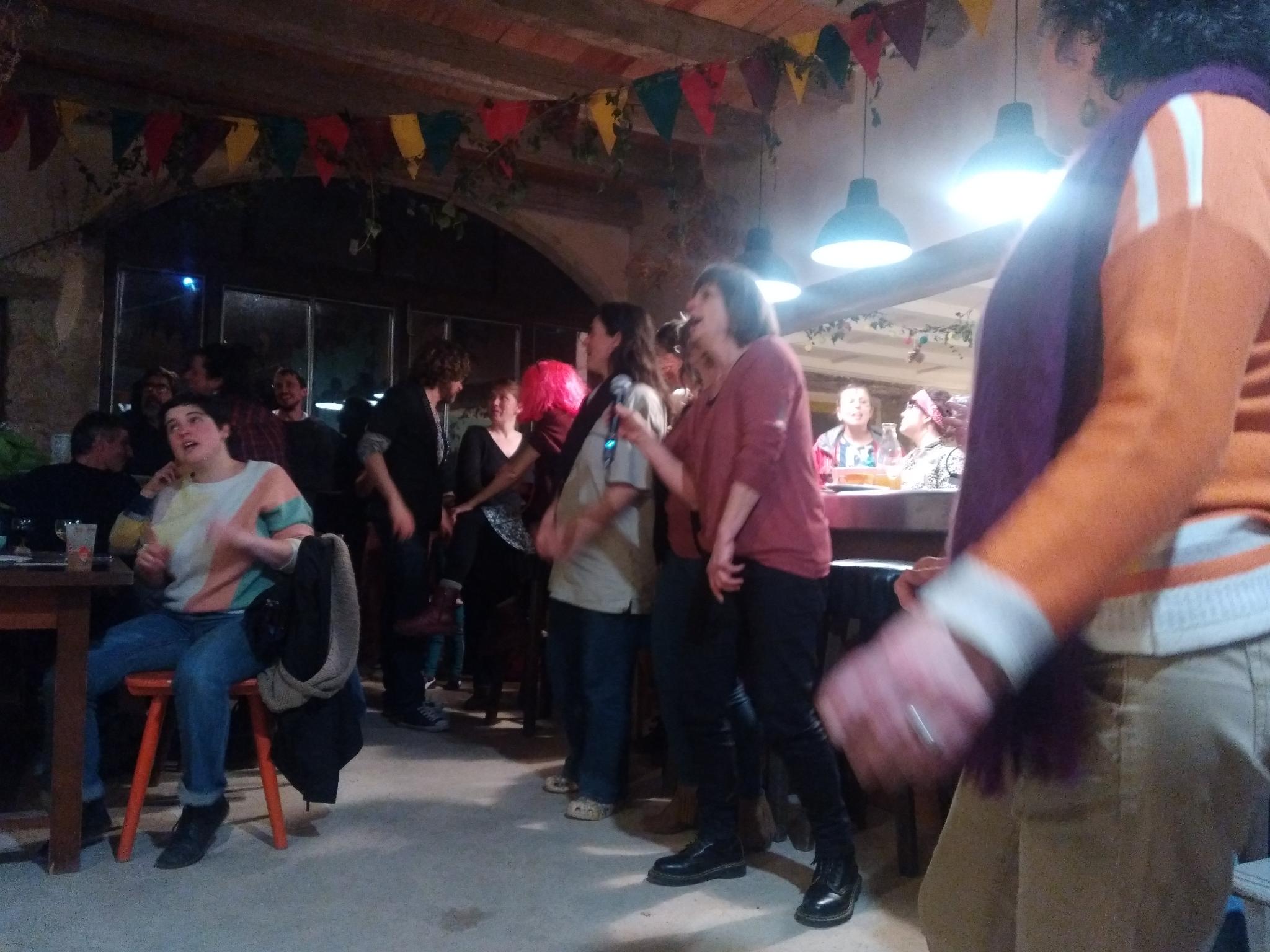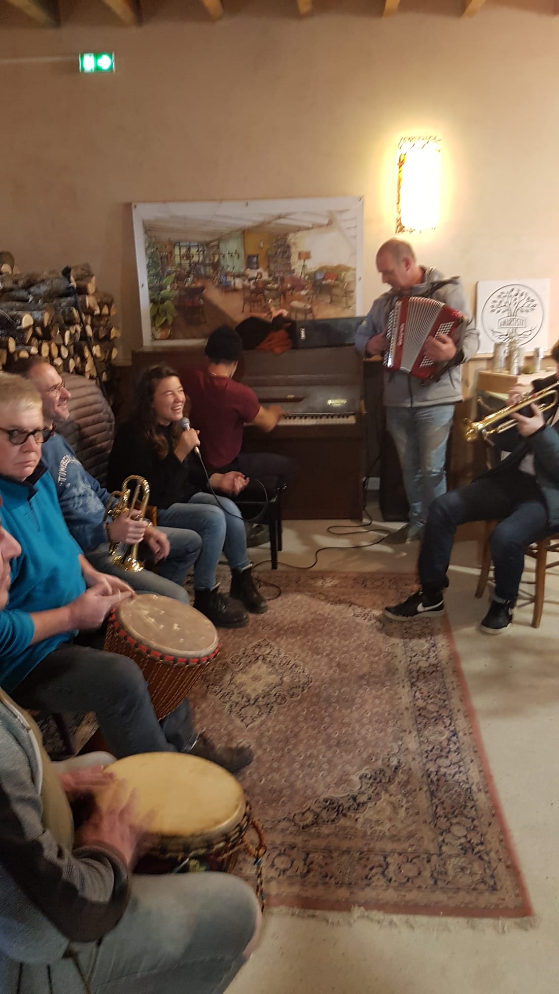 Sans être une institution le café du samedi matin est devenu le rendez-vous autour desquelles tournent d’autres activités comme la bibliothèque et l’achat groupé qui continuent à chercher La formule qui va bien. De loin en loin des repas de midi auberge espagnole se sont improvisés et des après-midi polyfolie, jeux, vannerie, contes, salon de thé et autres se sont greffés. Par petites touches Les unes et les autres s’essayent à être derrière le bar ou proposer une activité et c’est pleinement l’enjeu.